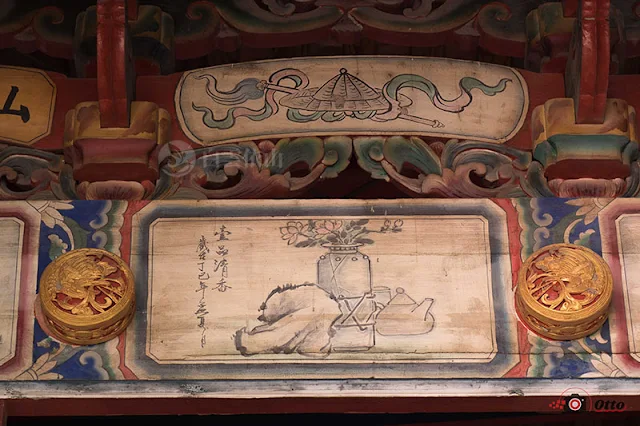 左次間對聯:「文」在茲乎玉牒琅函可達、「蔚」然秀美卯山假水之靈;右次間對聯:「文」昌乃主考選銓衡祿籍、「炳」社專為育才興學修齊。上下聯裡,用"藏頭"的方式嵌入"文蔚"及"文炳"二字,道出文昌廟建廟溯源典故-清同治2年(1863)由「文蔚社」和「文炳社」鳩資合建北屯文昌廟。